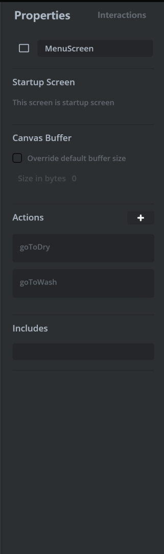 Create two actions in the menu interface, corresponding to the two menu elements we designed. Then, go to the interaction tab on the right and create an interaction that connects the two screen switching elements (the functional pages need to be created beforehand).