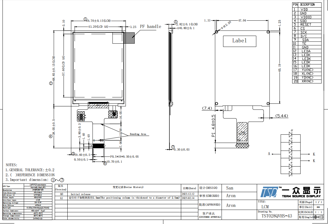 Bei diesem Anzeigemodul handelt es sich um einen transmissiven Farb-Aktivmatrix-TFT (Thin Film Transistor). Flüssigkristallanzeige (LCD). Dieses Modul ist bestehend aus einem TFT-LCD-Modul, einer Treiberschaltung und einer Hintergrundbeleuchtungseinheit. Die Auflösung eines 2.8 „enthält 320*240 Punkte und Die Aktiver Bereich Ist 43,2 (B) x 57,6 (H)